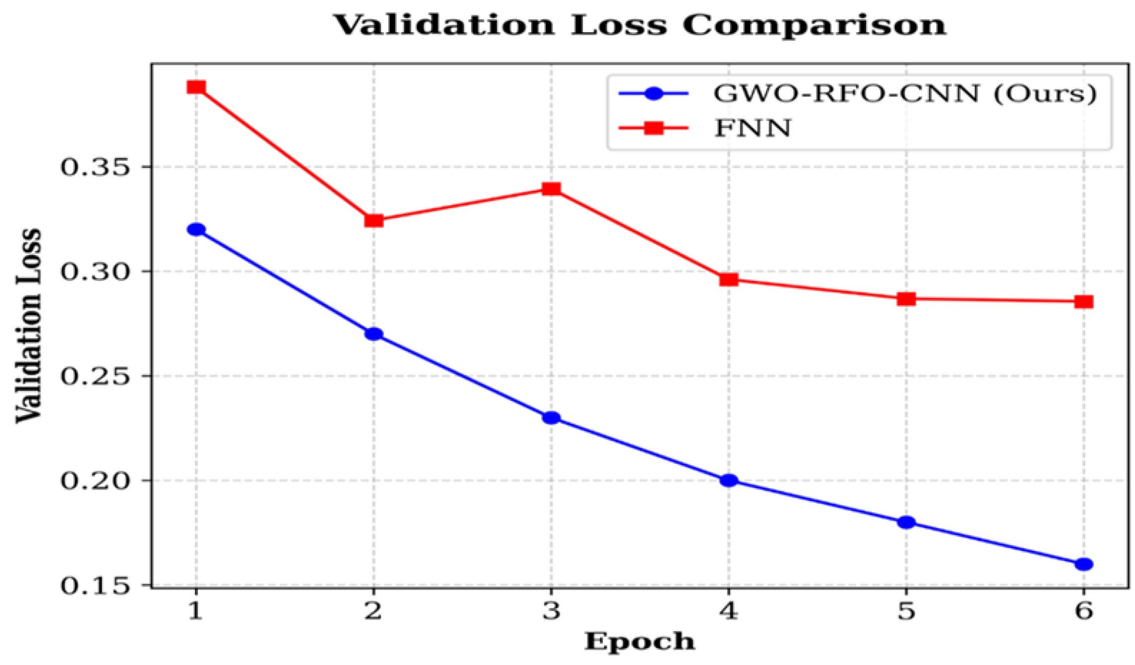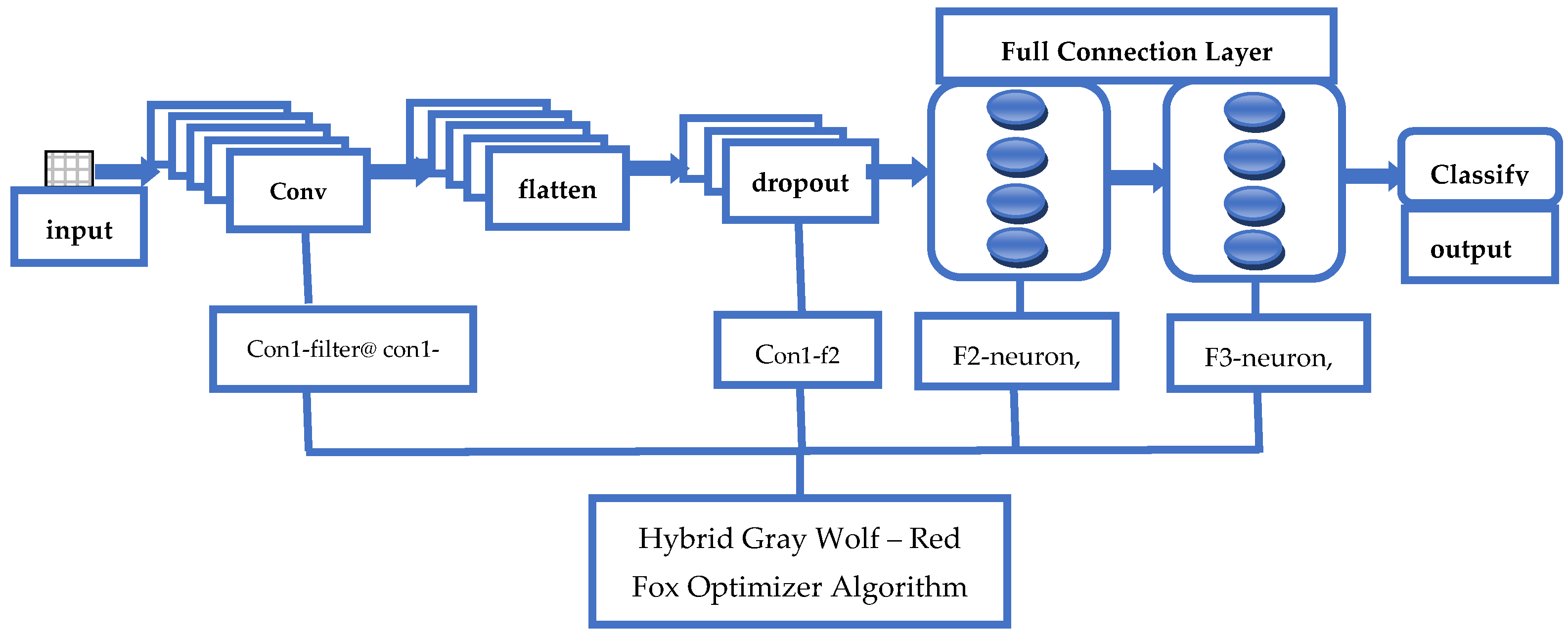 | Input: N = Total populations, d, t_max 1. Initialize parameters for GWO, RFO, and CNN. 2. Generate the initial population. 3. While (t < tmax) 4. Evaluate the fitness for each individual by training CNN and computing accuracy. 5. Update best solutions (alpha, beta, delta for GWO; escaping/hunting strategies for RFO). 6. Update positions of individuals using: - GWO: Alpha, Beta, Delta influence. - RFO: Random escaping and hunting strategies. 7. Check stopping condition (max iterations or convergence). 8. If stopping condition met: Return best solution (optimized hyperparameters, accuracy). 9. Else: Continue to next iteration. 10. t = t + 1. 11. End while. 12. Return best optimized solution. |