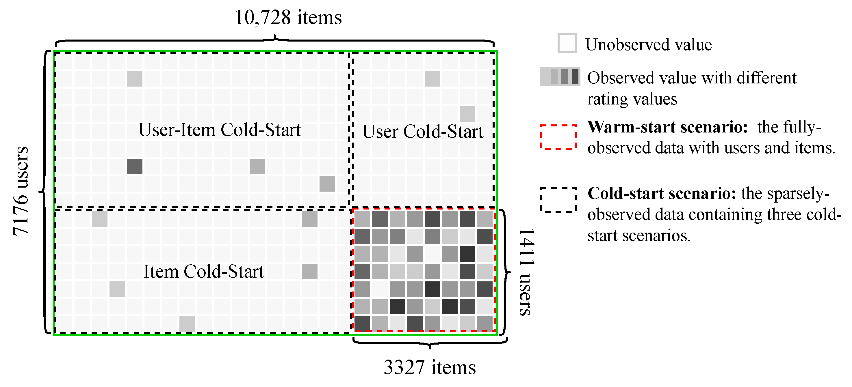- User–Item cold-start scenario (upper left): new items recommended to new users.