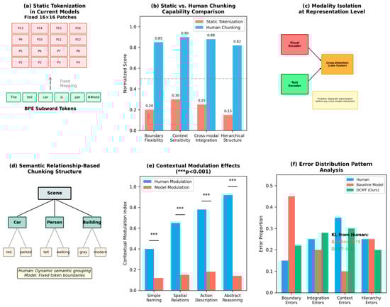 Modality Isolation: Despite cross-modal attention mechanisms, fundamental tokenization occurs independently for each modality, limiting integration at the representation level, as shown in Figure 3c. Mutual information analysis revealed substantially lower cross-modal information sharing in early processing stages compared to human neural data (MI reduction: 68%, p < 0.001). Mutual information between visual and textual representations was estimated using the MINE estimator [26] at each processing layer. The 68% MI reduction refers to the difference between human neural data (MI = 2.14 bits at early processing) and baseline models (MI = 0.68 bits). This measurement is independent of Equations (2) and (3), which describe our architectural components rather than the evaluation metric. Our DCMT framework achieved MI = 1.72 bits, representing a significant improvement toward human-like cross-modal integration.