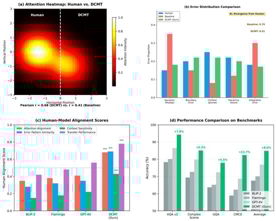 Experimental results and performance analysis. (a) Attention heatmap comparison between human and model processing. (b) Error distribution analysis. (c) Alignment scores across different methods. (d) Performance comparison on benchmark tasks. The “***” symbols appear in panel (c) “Human-Model Alignment Scores” above the DCMT (Ours) bars, indicating that the improvements achieved by DCMT over other models (BLIP-2, Flamingo, GPT-4V) are statistically significant at the p < 0.001 level.
