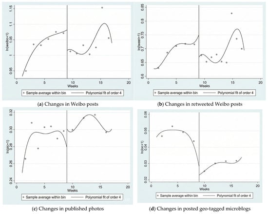 In Formula (1), is the relevant outcome variable of the unobserved effects, including posting microblogs, reposting microblogs, posting photos, and posting geo-tagged microblogs. is a dummy variable equal to 1 if falls after the introduction of the new function (28 April 2022), and 0 otherwise. is the index coefficient after the function change, which mainly reflects the discontinuity effect size of the outcome variable after the launch of the new function. indicates the time period, where the time period is the number of weeks relative to the 9th week (cutoff week). indicates the time (week) when user i registers a Sina Weibo account in . is the total number of microblogs posted by user i since registration. is a dummy variable representing the gender of the user i: 1 if male and 0 otherwise.