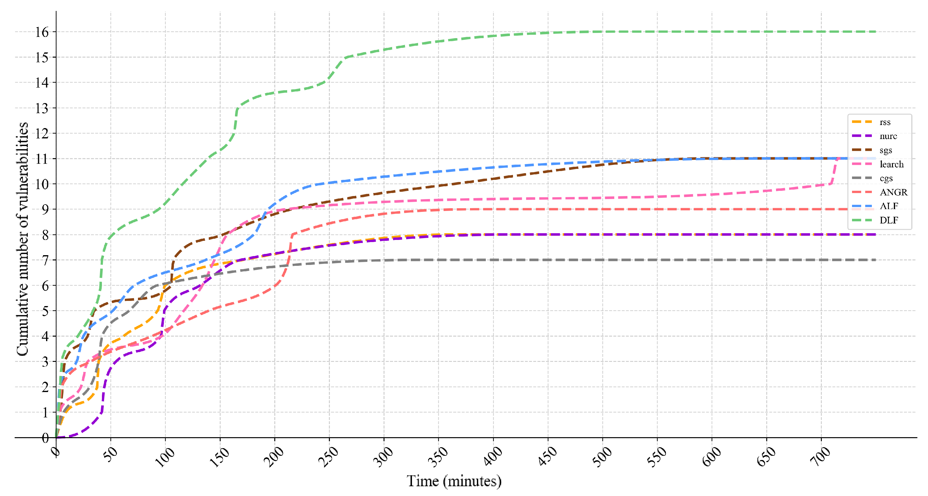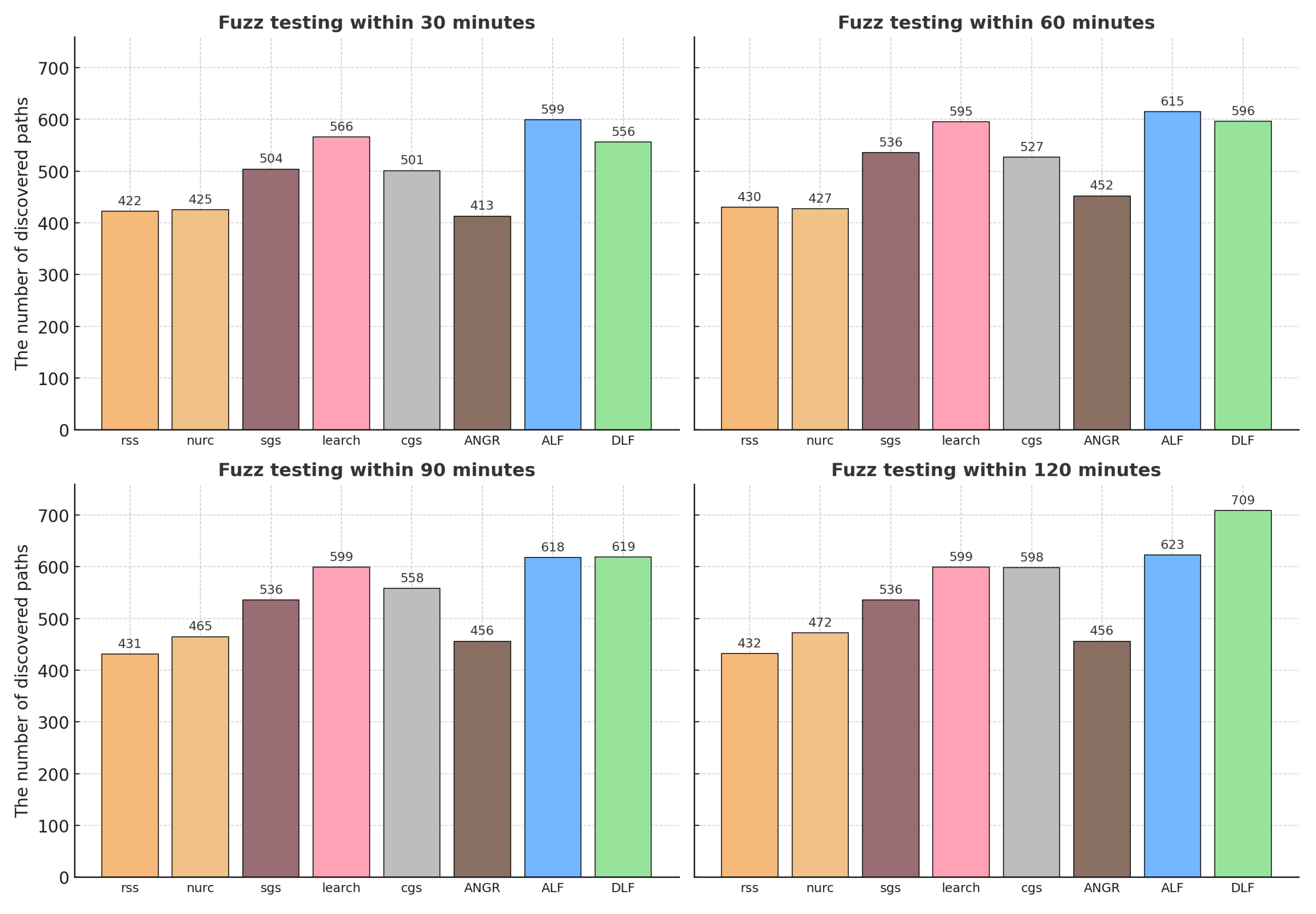Extensive empirical validation on multiple datasets. The effectiveness of DLF is evaluated on several real-world benchmark datasets. Experimental results demonstrate that DLF consistently outperforms existing methods in terms of vulnerability detection rate, path coverage, and execution efficiency.