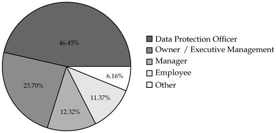 A total of 215 questionnaires were included in the evaluation. The average age of the respondents was 50.2 years and the median age was 52 years (range 22–78 years). The respondents who provided information about their sex (), showed a significantly higher proportion of men at 71.98% () according to women with 26.57% () and 1.45% () identified as diverse. Among the respondents who indicated the sector they work in (), most assigned themselves to the private sector (46.45%; ), followed by public institutions (45.97%; ), non-profit organisations (4.74%; ), and other sectors (2.84%; ). Regarding the professional role of respondents () (Figure 2), the most frequently cited position was data protection officer (46.45%; ), followed by owner/management with 23.70% (), executives with 12.32% (), employees with 11.37% () and other roles with 6.16% (). The category ‘Other’ included activities in organisation/digitalisation, IT manager, IT department, data protection manager, information security and data protection officer, research data management, quality management coordinator, municipal manager, data protection coordinator, and digitalisation and information security officer.