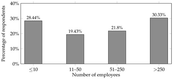Size of institutions and companies by number of employees (). Among the respondents, 30.33% () were affiliated with large organisations (>250 employees), 28.44% () with micro-enterprises (≤10 employees), 19.43% () with small enterprises (11–50 employees), and 21.80% () with medium-sized enterprises (51–250 employees).