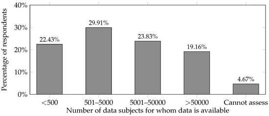 In addition, the sample was asked how many different individuals had PD available (Figure 4). In the sample of valid responses (), 29.91% () most frequently reported 501 to 5000 PD in the institution/company. A further 23.83% () stated that they had stored between 5001 and 50,000 PDs, 19.16% () indicated that they had stored more than 50,000 PDs, and 22.43% () said that they had fewer than 500 PDs. This means that 72.90% of the sample reported having at least 500 PD, and more than 42.99% reported having more than 5000 PD in their institution/company.
