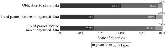 Respondents were also asked whether and how the collected PD is already being shared (; Figure 5). Here, 59.15% () of respondents stated that there is an obligation to share PD with third parties, while 36.62% () had no responsibility, and 4.23% () were unaware of any obligation. In addition, 60.09% () said that anonymised data is not made available to third parties, while 33.33% () already do so, and 6.57% () did not provide any information on this question. Furthermore, 33.33% () stated that they also pass on PD to third parties in non-anonymised form, for example, based on contracts. In comparison, a majority of 59.15% () said that they do not do so, and 7.51% () did not provide any information on this.