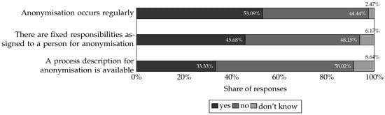 Furthermore, the respondents (; Figure 7) specified their experiences with anonymisation. 53.09% () stated that anonymisation is carried out regularly, while 44.44% () denied this and 2.47% () did not provide any information. Fixed responsibilities for one person in connection with anonymisation were indicated by 45.68% (), with a majority of 48.15% () seeing no fixed responsibilities for this in the institution/company, and 6.17% () not providing any information. A concrete process description for anonymisation was available for 33.33% () of respondents, while 58.02% () did not have such a description, and a further 8.64% () of respondents were not aware of any such description.