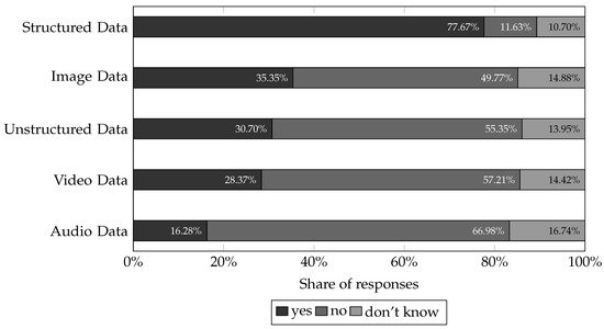 When asked which type of data anonymisation is most relevant in practice (; Figure 8), structured data was cited most frequently (77.67%, ), followed by image files (35.35%, ) and unstructured files (30.70%, ). In contrast, the prevailing opinion was that anonymisation was not necessary for the majority of audio and video files. In an open question, semi-structured data (e.g., emails), data from electronic evaluations, data available as PDF files (e.g., wage evaluations, traffic measurements, visitor guidance), files in DICOM format from imaging diagnostics in the clinic, and telemetry data (e.g., personal tachographs) were specified as special data types for which anonymisation would be helpful.