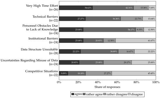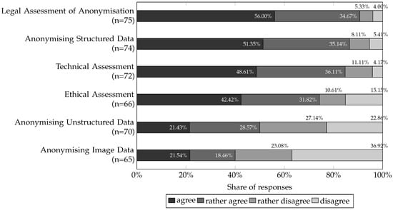 In addition, respondents were asked about their use of the collected PD. Suppose the responses are combined into a dichotomy (agreement = ‘agree’ and ‘tend to agree’; disagreement = ‘tend to disagree’ and ‘disagree’), 94.84% () of the respondents use the internal PD exclusively for the originally specified purpose. In total, responses were received, with two () respondents indicating “don’t know”. Furthermore, 46.92% () of respondents see potential added value in the existing PD for third parties, while 41.71% () do not see this, and 11.37% () stated “don’t know”. Here, a total of responses were included. In addition, a minority (33.02%, ) of respondents stated that the potential for internal use of existing PD is fully exploited, while a majority (56.60%, ) disagreed, and 10.38% () stated “don’t know”. In total, responses were analysed for this question. Furthermore, 22.65% () of respondents said that anonymised PD has internal reuse, while 75.00% () disagreed, and 2.36% () stated “don’t know”. The total number of responses for this question was .