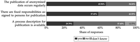 Furthermore, processes relating to publication were surveyed and multiple responses were possible here. (, Figure 10). About publication, 65.96% of respondents () stated that they regularly publish anonymised data. In 57.45% () of cases, fixed responsibilities were specified for persons responsible for the publication of data. However, only 29.79% () regulate the publication of data through a process description.