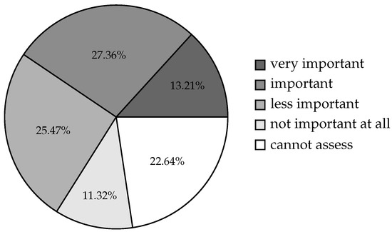 About the importance of OD (, Figure 13), only 13.21% () of respondents in the sample considered the availability of OD to be essential, and 27.36% () considered it to be important. Furthermore, 25.47% () considered availability to be less critical, and 11.32% () stated that OD was not important at all for the institution/company and 22.64% () did not provide any information. If the answers are dichotomised, most respondents consider the availability of OD to be critical (40.57%; ), while an almost equally large proportion consider the availability of OD to be less important or not necessary for the institution/company (36.59%, ).