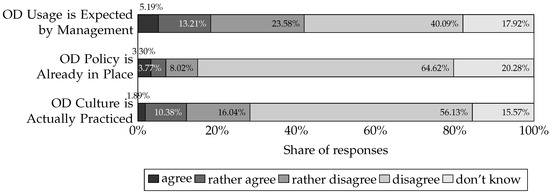 Previous experience with OD was also surveyed (, Figure 12). The statement regarding intended future use of OD received the most agreement (42.18%, ), with 18.48% () rejecting future use and 39.34% () not providing any information on this. A minority of 22.64% () stated that they already use OD, while a clear majority of 59.43% () said that they do not yet use OD, and a further 17.92% () did not provide any information on this. The current existence of internal initiatives for the use of OD in institutions and companies was affirmed by 13.27% (), while 53.55% () denied this, and 33.18% () did not provide any information on this.