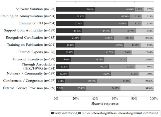 The fourth research question examined desired support services. The most frequently cited needs were governmental or institutional support through human, technical, and financial resources, consistent with international findings [7]. Respondents also called for research and development projects to create suitable technical tools. Training and knowledge transfer were identified as central elements for sustainable implementation [1]. Professional associations, research consortia, and networks such as chambers of industry and commerce should offer specialised training to strengthen institutional expertise and foster OD adoption. Recognised certification systems for anonymisation and publication processes were viewed as valuable instruments for enhancing trust and credibility [14,45,46]. To further promote transparency and trust, differentiated access models defining user rights and restrictions could also be implemented. Leadership and management play a crucial role in advancing anonymisation and OD publication—both as role models [7] and as providers of best practices [39]. Targeted training programmes for executives are therefore essential to establish a sustainable OD culture.