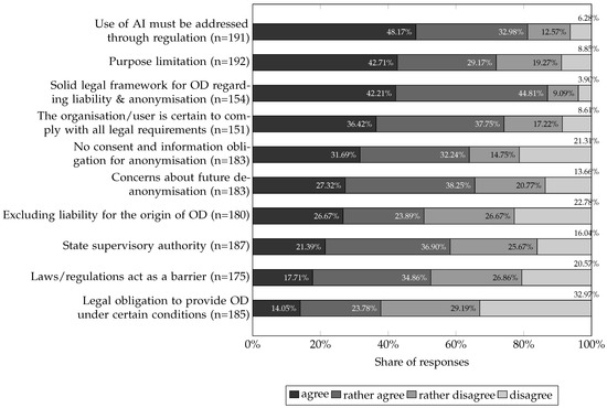 Regarding legal and ethical aspects, most respondents reported compliance with current legal requirements but expressed concern about future risks of re-identification arising from technological advances. Legal issues primarily concern the use of AI in data processing, with broad support for regulatory frameworks that balance AI’s benefits and risks. Many respondents also supported access restrictions, clear liability rules for re-identification, and a national supervisory authority for OD processes. However, most rejected a general obligation to inform data donors about anonymisation.
