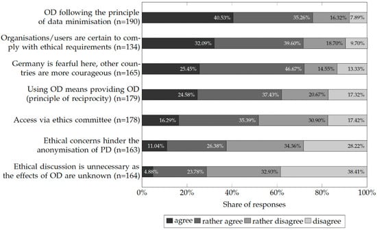 Furthermore, respondents were asked about their understanding of OD (). 69.48% () of respondents agreed with the statement that OD should only be provided with controllable access, while 16.43% () disagreed and 14.08% () did not answer. Similarly, 67.14% () agreed with the statement that there should be clear restrictions on the use of OD, while only 15.96% () disagreed and 16.90% () did not respond. At the same time, a clear majority of 58.69% () were in favour of providing OD free of charge, while 18.31% () believed that it should not be free of charge, and 23.00% () did not express a clear opinion on this. Similarly, a majority of 54.67% () were in favour of OD containing anonymised data without exception, while 23.83% () rejected this and 21.50% () did not comment on this. At the same time, 27.57% () were in favour of OD being possible even without anonymisation, while 44.39% () rejected this, and 28.04% () did not express a clear opinion. When asked whether OD requires licensing, 46.48% () believed that OD should generally be provided under a licence, while 25.35% () rejected this and 28.17% () did not give a clear answer.