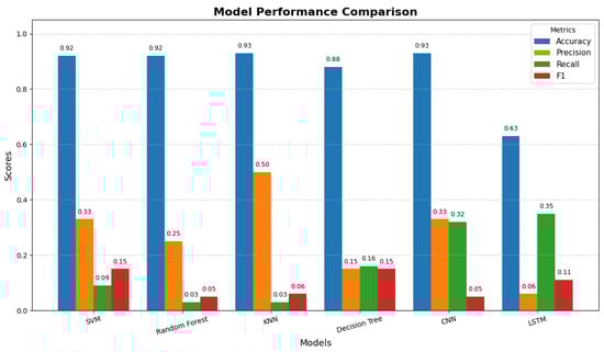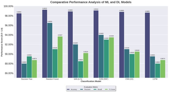 When applied to real data, the SVM outperforms the other traditional machine learning models in terms of accuracy and recall. This heave and swing immediately indicate that the SVM is capable of accurately and promptly predicting positive events in terms of accuracy, as demonstrated by the accuracy and recall comparative study in Figure 6. In a comparable manner, it can identify a high proportion of actual positive events in terms of memory without sacrificing any of the characteristics. Figure 7 illustrates how poorly both the KNN and the DTC perform when tested on actual data in terms of achieving high accuracy and high recall. This is because, as Table 8 demonstrates, these models frequently either incorrectly anticipate the positively labeled samples or misdiagnose positive cases in terms of low recall. The results illustrated in Table 8 show that when considering the optimized traditional models, XGBoost achieved 0.9978 and tuned KNN achieved 0.9966 accuracy compared to the tuned LSTM, which achieved 0.9884. This finding aligns with the established literature: when datasets are relatively small, have limited temporal depth, or exhibit strong feature separability, classical machine learning models often outperform deep learning architectures. In these cases, XGBoost effectively leverages gradient-boosted decision rules to handle nonlinear boundaries, while KNN benefits from well-defined cluster structures in the feature space [58].