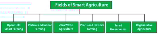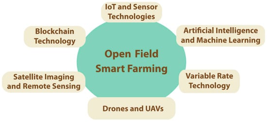Open field smart farming harnesses the power of the Internet of Things (IoT), artificial intelligence (AI), and other new technologies to optimize crop production and resource management. The IoT refers to the concept of allowing an autonomous and automated exchange of information between real-world devices, exploiting network technologies such as Radio-Frequency IDentification (RFID) and Wireless Sensor Networks (WSNs). Some of these devices, termed sensors, gather information concerning their environment (e.g., soil moisture, air temperature and humidity, animal temperature, and heart rate), while a second group of these devices, referred to as actuators, arrange for performing actions that modify their environment (e.g., perform irrigation, turn air conditioning on or off, regulate lighting, or issue alerts for farmers). Finally, a third group of devices provide services for storing and managing sensed data, as well as taking data-driven decisions on the actions that should be taken by actuators [1,2]. In this context, drones and UAVs provide aerial imaging and precision spraying, while satellite imaging offers extensive data on crop health, soil conditions, and weather patterns, enabling more informed decision-making [3].