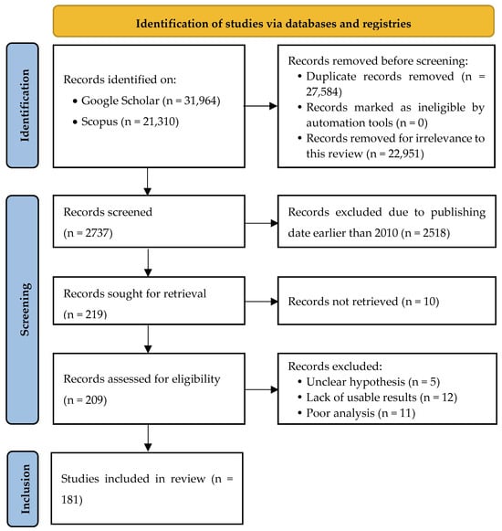 This review adopts a research methodology based on the PRISMA (Preferred Reporting Items for Systematic reviews and Meta-Analyses) guidelines and recommendations. PRISMA offers a systematic and rigorous methodology for reviewing and synthesizing the available literature [29]. Figure 2 illustrates the application of the PRISMA methodology in the context of the presented research.
