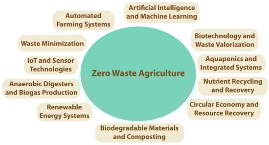 Zero waste agriculture is an innovative approach focused on creating circular agricultural systems where waste is minimized, repurposed, and reintegrated into the farming cycle. This paradigm shift from conventional farming aims to enhance sustainability, improve resource efficiency, and reduce the environmental impact of agricultural activities. The integration of advanced technologies, such as the IoT, AI, biotechnology, and renewable energy systems is pivotal in achieving the goals of zero waste agriculture. Figure 5 depicts the most important technologies applied in the field of zero waste agriculture.