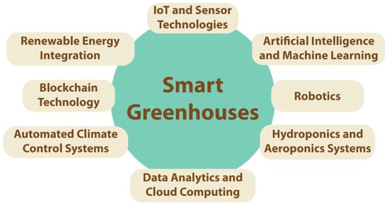 Smart greenhouses integrate the IoT, AI, and automated systems to maintain optimal growing conditions, improve crop yields, and enhance resource efficiency. Automated irrigation systems and robotic harvesters reduce labor costs and water waste, while integrated pest management systems use sensors and AI to manage pest populations sustainably [19,20,21].