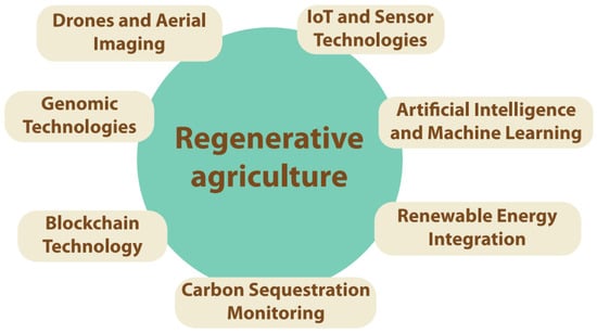 Regenerative agriculture aims to restore soil health, increase biodiversity, and amplify carbon sequestration [22], promoting long-term ecological sustainability. Technologies such as cover cropping, soil health sensors, and carbon sequestration measurement tools are required to advance these practices [23]. AI and the IoT further enhance the monitoring and implementation of regenerative techniques [24,25].