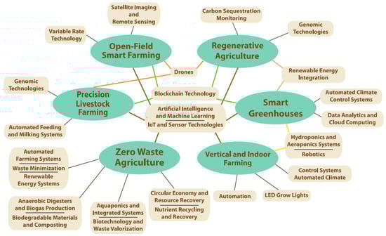The agricultural sector is undergoing a transformative evolution driven by the integration of cutting-edge technologies. As global population growth continues to escalate and climate change imposes new challenges, there is a pressing need to transform traditional farming practices—exploiting new technologies—to ensure food security, sustainability, and efficiency. This paper explores the advancements and applications of modern technologies in diverse agricultural domains: open field smart farming, vertical and indoor farming, zero waste agriculture, precision livestock, smart greenhouses, and regenerative agriculture (Figure 1).