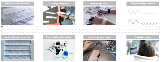 Figure 2 shows an overview of the pipeline of this work, from our initial fabrication and design workshop for ShapeBand iteration to a follow-up qualitative study. To provide haptic feedback with its shape-changing capabilities, we took inspiration from the sensation of poking bubbles. This led to the use of a deformable and user-friendly soft silicone material to create the wristband, allowing for a more engaging and responsive tactile experience to aid in anxiety regulation.