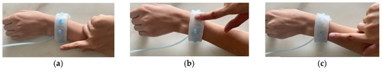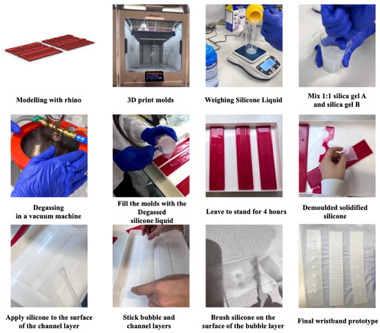 After some initial simple ergonomic low-fidelity modeling to ascertain the Shapeband dimensions, we designed the device in Rhino CAD in two sections—the lower liquid flow channel section and the upper bubble section. Negative molds of these sections were then modeled and printed using a 3D Printer (Ultimaker S5, Utrecht, The Netherlands) in PLA. The Ecoflex Silicone was prepared by manually mixing equal weights of uncured Part A and Part B, degassing the mixture in a vacuum chamber, carefully pouring it into the molds, and leaving it for 4+ h to set. An additional brushed-on layer was found to enhance the visibility and strength of the bubbles when applied to the wristband’s top surface. This additional step was incorporated as the final stage in the wristband production process to achieve improved results (see Figure 3 and Figure 4 for the wristband fabrication processes and initial four wristbands).