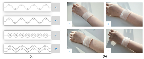 Initial wristband design: (a) four design iterations; (b) final four shape-changing wristbands, A–D represent four different wristband design.
