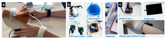 ShapeBand functional prototype: (a) The overview of ShapeBand interaction, (b) detailed components of ShapeBand, (c) heating elements used with ShapeBand.