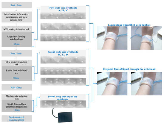 For the second group, wristbands B, C, and D were tested in a randomized sequence, with the colored liquid flowing in these wristbands at a preset frequency upon the PPG sensor detecting adverse emotions. The participants first observed the water flow to examine the effectiveness of its passive regulation and then actively interacted with the wristbands by pressing on the bubbles. The aim was to explore the combined effectiveness of passive and active regulation strategies and assess how visual feedback changes and multisensory integration impacted emotional regulation and the alerting effects. The final liquid-flow wristband from the previous set, combined with the PPG sensor-controlled heating pad, was used to evaluate the effect of multisensory stimulation on attentional attraction, while taking the stress-inducing Stroop Color Word Conflict Test. At the end of the study, the participants took part in a semi-structured interview to provide qualitative insights. The detailed process of this study is outlined below.