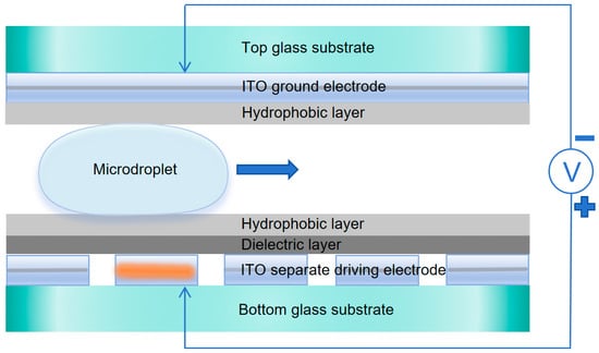 In a closed digital microfluidic chip, the top electrode serves as the ground electrode, while the bottom electrode applies the external driving voltage. When the driving electrode is inactive, and assuming the droplet’s initial contact angles are equal, the droplet remains symmetrical. Upon activation of the adjacent driving electrode, the droplet transitions from a symmetrical to an asymmetrical shape as the contact angle decreases, which occurs due to the reduction in surface free energy at the solid–liquid interface. This creates a pressure difference inside the droplet, causing it to move toward the activated electrode. This is the driving principle of droplets in electrowetting-based digital microfluidic systems [,,,].