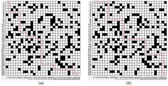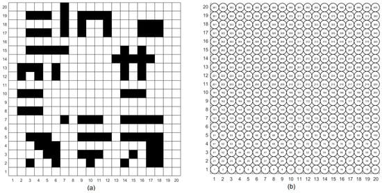 In this study, when performing droplet path planning for the EWOD device, each grid in (a) corresponds to an electrode on the chip, which is equivalent to each vertex in (b). In the grid model, the black grids represent faulty electrodes, through which droplets cannot pass, while the white grids represent normal electrodes, through which droplets can pass. Based on the droplet movement characteristics in EWOD devices with rectangular-shaped driving electrodes, droplets are best suited for movement in the four cardinal directions: north, south, east, and west. Therefore, in the simulation experiments of EWOD devices conducted in this study, the droplets move along these four cardinal directions.