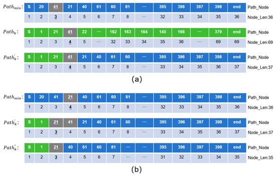 Step 2: Begin at the m-length path node of the -th individual (e.g., Node 166 in Subfigure (a) of Figure 4). Search for the corresponding path node in elite individual . If found, move to step 3. If no match is found, decrement by 1 towards the starting node (i.e., select the previous node) and repeat step 2. If no matching node is found even after decrementing to the second path node, proceed to step 4.