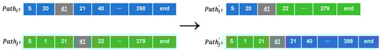 Step 3: Take the matching node identified in step 2 (e.g., Node 41 in Subfigure (a) of Figure 4) as the boundary. Retain the -th individual’s initial path segment and replace the subsequent path with the elite individual’s path beyond the matching node.