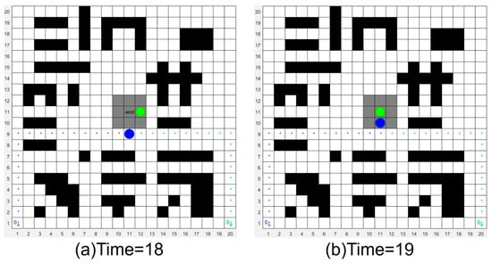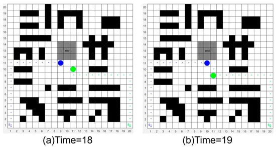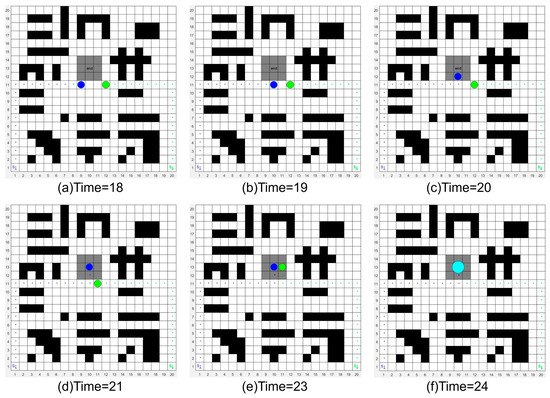 The simulation results are shown in Figure 9. After the droplets reach timestamp 18, they are about to collide at the next timestamp. If Strategy 1 were applied, the distance between the two droplets would not satisfy the constraint given by Equation (1) (i.e., the distance between the droplets would be less than 2), causing them to fuse in a non-synthesis region. Therefore, Strategy 2 is employed, where Droplet B retreats to the previous grid node, allowing Droplet A to pass through normally. After reaching timestamp 21, Droplet A arrives at its destination. By timestamp 24, Droplet B reaches its destination, and the two droplets successfully complete the reaction synthesis.