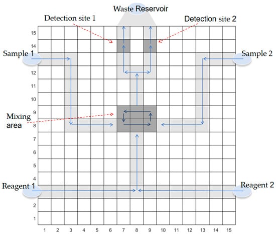 In this study, we apply multiplexed biochemical detection examples from references [,,] to perform online detection for a digital microfluidic biochip with a 15 × 15 array unit, as illustrated in the test model in Figure 11.