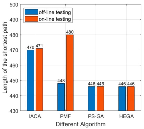 In offline detection, PMF yields better results than IACA. However, in online detection, IACA outperforms PMF. Both our improved genetic algorithm and PS-GA achieve a result of 446 in both offline and online detection, reaching the optimal Eulerian path value. Compared to IACA, this represents a 5% improvement. Therefore, our improved genetic algorithm demonstrates strong testing performance in both offline and online settings, making it a highly effective testing method.