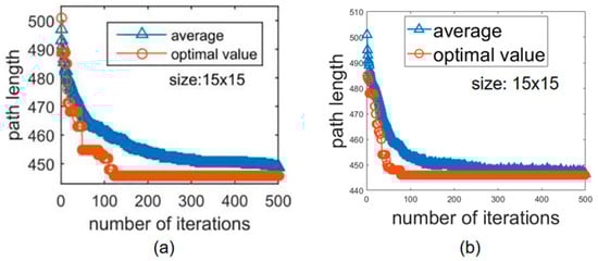 Convergence curve of droplet path planning. (a) The traditional ant colony algorithm. (b) The improved GA in this study.