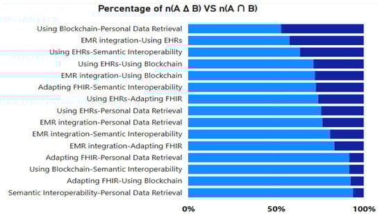 The Jaccard index between “using blockchain” and “personal data retrieval” is 0.47, which indicates strong alignment and synergies between these two features. Personal data retrieval is an essential part of patient-centered interoperability. Therefore, this alignment also shows blockchain as being an essential part of a desired patient-centered data interoperability solution. We analyzed all the possible combinations of the common features. We sorted them in Figure 4 from a good combination for developing systems (higher Jaccard index) to great candidates for further research to create unique contributions (lower Jaccard index).