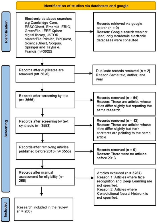 Four categories were created from the 266 articles that met the requirements for inclusion. We started by examining the distribution of these papers by year of publication. The primary objectives and areas of emphasis of these essays were also significant. Next, we looked at the distribution of these articles based on the type of CNN they represented. Finally, we categorized the included publications according to the CNN types they employed for facial recognition. The outcomes for each category are described in the remainder of this section.