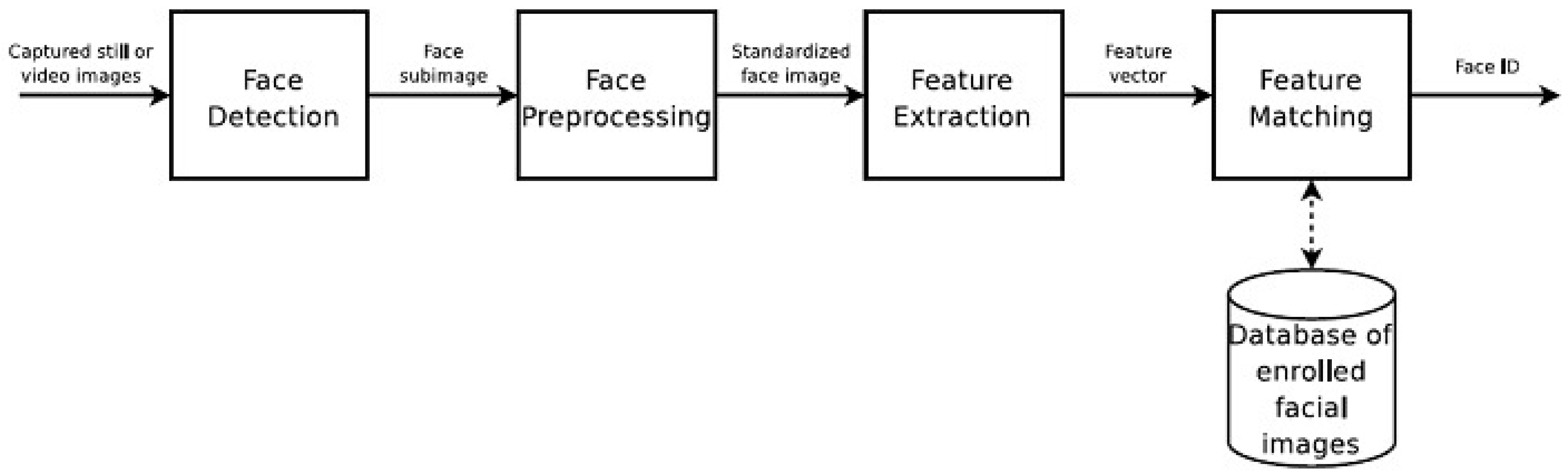 A face recognition system consists of four steps: face detection, face pre-processing, feature extraction, and face matching [26]. The stages are illustrated in Figure 1 below.