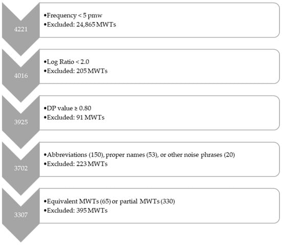 As mentioned above, many studies on collocations use mutual information (MI) as a statistical measure to calculate the number of times that individual words co-occur compared with the number of times they occur separately. Such approaches adopt a granular approach to identify which words combine to form an MWT but have the disadvantage of being less suitable for measuring the strength of association for sequences of three or more words []. This study took the approach of considering MWTs as individual units, which allowed us to use the same analytical methods deployed by corpus linguists who have created lists of individual words or lemmas. Frequencies of occurrence for each MWT were counted in the whole corpus (CoMeT), in each sub-corpus, and in the enTenTen21 corpus, which played the role of a reference corpus.