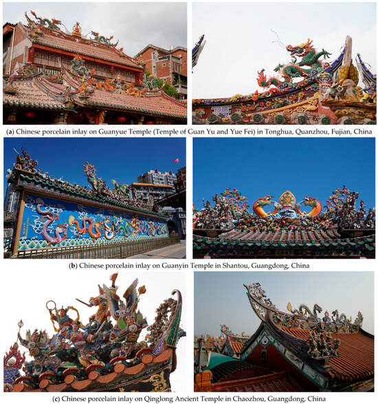Porcelain inlay is a unique traditional architectural decoration craft from China’s Fujian and Guangdong provinces [9,10]. Its history can be traced back to the Wanli period of the Ming Dynasty. It reached its peak around 1900 and became an important part of ancestral halls, temples, and other buildings in Fujian and Guangdong [11]. It is widely distributed in the southeast corner of China and overseas Chinese communities in Southeast Asia. The “inlay” in Chinese porcelain inlay means embedding and inlaying. The craftsmanship of inlaying is what gives Chinese porcelain inlay its name. Chinese porcelain inlay craftsmen use porcelain materials with various glazes and lusters through cutting, hammering, inlaying, bonding, and stacking to form traditional architectural decorations or craft ornaments with flat, floating, or three-dimensional inlay effects, such as figures, flowers, and birds, insects and fish, landscapes, and animals.