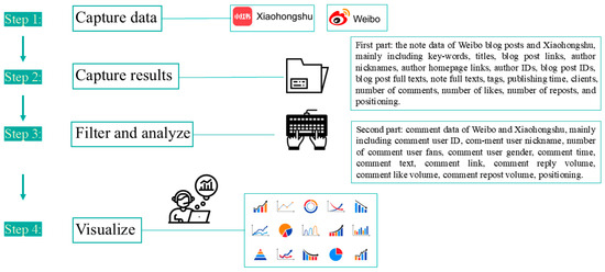 The data sources used in this study were Sina Weibo and Xiaohongshu, two major social media platforms. The researchers collected blog posts and comment data from these two platforms from January 2020 to December 2023. We roughly divided the results of data collection into two parts (Figure 2).
