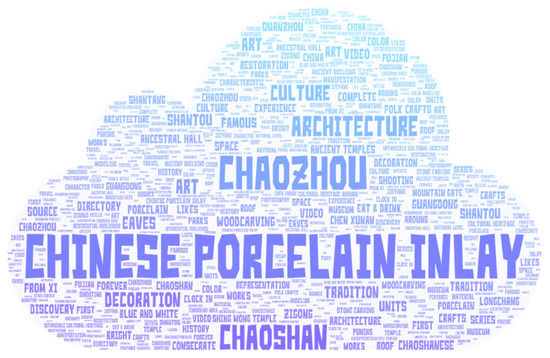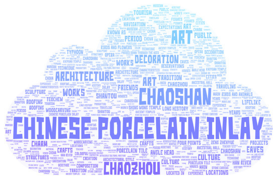 Commonly used tools in text analysis include word frequency analysis and word cloud diagrams. Word frequency analysis refers to counting the frequency of occurrence of words in text. We collected 2717 valid Weibo blog posts. We conducted word frequency analysis on the obtained blog posts using high-frequency words from Weibo blog posts, such as “Chinese porcelain inlay”. Table 1 presents the results. “Chinese porcelain inlay” had the highest frequency, appearing 3408 times; “Chaozhou” was second, appearing 2598 times, and “Chaoshan” appeared 1926 times. This shows that in the online text data that we collected, users’ knowledge of inlaid porcelain is mostly concentrated in the “Chaoshan” area (including Chaozhou, Shantou, and Jieyang). As a national intangible cultural heritage site, the inlaid porcelain works and craftsmen in this area are also more frequently mentioned on the Internet. “Architecture”, “culture”, “decoration”, “art”, “tradition”, and other words are also frequently mentioned, indicating that in our data sample, Chinese porcelain inlay, as a unique traditional architectural decoration craft, is highly recognized for its cultural and artistic attributes, reflecting users’ interest in and demand for Chinese porcelain inlay. To ensure the reliability of media data, this paper also collected 238 valid pieces of data from Xiaohongshu notes. Table 2 displays the results. The high-frequency words in these notes are basically consistent with the high-frequency words in Weibo posts, and the above words all ranked in the top nine.