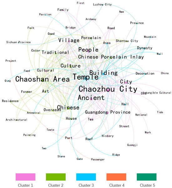 This article uses Gephi software (2022 version) to perform network semantic analysis and shows the keyword co-occurrence network of the top 200 Weibo and Xiaohongshu blog posts. Each dot in the figure represents a keyword, and dots of different colors represent different cluster classifications. Colored lines represent the co-occurrence relationships of keywords. Taking the semantic network analysis diagram of Sina Weibo blog posts as an example, this paper divides the collected Weibo blog keywords into five clusters. As shown in Figure 5, purple represents cluster 1, accounting for 39.06% of keywords, and these include “Chaozhou City”, “Ancient”, “People”, etc. Cluster 1 focuses on the geographical distribution and local customs of inlaid porcelain. Grass green represents cluster 2, accounting for 26.56% of keywords, and these include “Chinese”, “Traditional”, “Overseas”, etc. This cluster focuses on the domestic inheritance and overseas dissemination of inlaid porcelain. Sky blue represents cluster 3, accounting for 25.00% of keywords, and these include “Temple”, “Building”, “Dynasty”, etc. Cluster 3 focuses on the history and carriers of inlaid porcelain. Orange represents cluster 4, accounting for 4.69% of keywords, and these include “Port”, “Taste”, etc. Cluster 4 focuses on the location advantages of inlaid porcelain. Dark green represents cluster 5, accounting for 4.69% of keywords, and these include “Sichuan Province”, “Luzhou City”, etc. Cluster 5 focuses on the introduction of the branches of inlaid porcelain art into Sichuan and Chongqing.