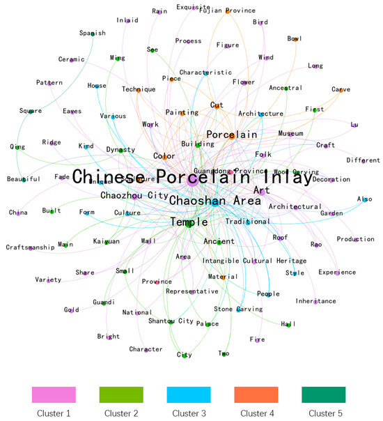 Using the semantic network analysis diagram of Xiaohongshu notes as an example, this paper divides the collected Xiaohongshu blog keywords into five clusters. As shown in Figure 6, purple represents cluster 1, accounting for 46.81% of keywords, including “Chinese porcelain inlay”, “Art”, “Intangible cultural heritage”, etc., and its focus is on the protection and inheritance of the intangible cultural heritage of inlaid porcelain. Grass green represents cluster 2, accounting for 21.28% of keywords, including “Temple”, “Ancient”, “Building”, etc., and its focus is on the carriers and cognition of inlaid porcelain. Sky blue represents cluster 3, accounting for 14.89% of keywords, including “Chaoshan Area”, “Traditional”, “Architecture”, etc., and its focus is on the geographical distribution and local customs of inlaid porcelain. Orange represents cluster 4, accounting for 11.70% of keywords, including “Porcelain”, “Cut”, “Technique”, etc., and its focus is on the craftsmanship and technology of inlaid porcelain. Dark green represents cluster 5, accounting for 3.19% of keywords, including “Spanish”, “Square”, etc., and its focus is on the comparative study of inlaid porcelain art. It is worth mentioning that the peripheral vocabulary, such as “Experience” and “Production”, can reflect Xiaohongshu users’ desire to understand Chinese porcelain inlay and their enthusiasm for experience creation. The platform has greatly promoted the inheritance of Chinese porcelain inlay culture in recent years, showcasing a large number of innovative Chinese porcelain inlay works, Chinese porcelain inlay experience courses, and handmade porcelain inlay experience packages.