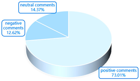 This paper collects 7771 valid Weibo comments and 1361 valid Xiaohongshu comments. We found through Python Snow NLP analysis that there were 5673 positive Weibo comments, accounting for 73.00% of the total; 981 negative comments, accounting for 12.62% of the total; and 1117 neutral comments, accounting for 14.37% of the total (Figure 7). There were 827 positive comments on Xiaohongshu, accounting for 60.76% of the total; 283 negative comments, accounting for 20.79% of the total; and 251 neutral comments, accounting for 18.44% of the total (Figure 8).