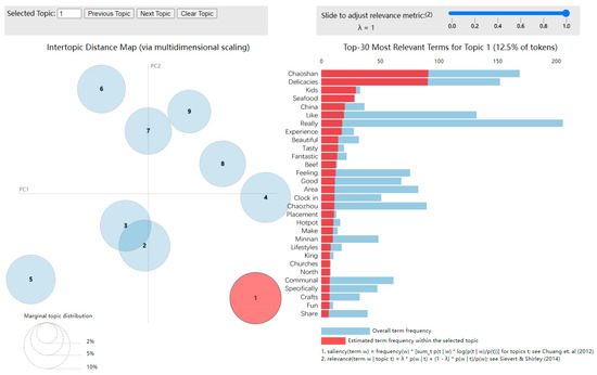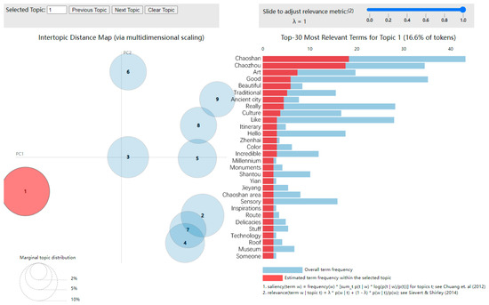 This paper employs the LDA topic model to analyze comment text regarding Chinese porcelain inlay on two prominent social media platforms. We ultimately decided to set the number of extracted topics at nine based on the trends of perplexity and consistency, as well as the clustering results under various numbers of topics. As shown in Table 3, the trained LDA model (Figure 9 and Figure 10) outputs nine topics and their corresponding keywords. The analysis of various topics in the comments on Chinese porcelain inlay is presented below.